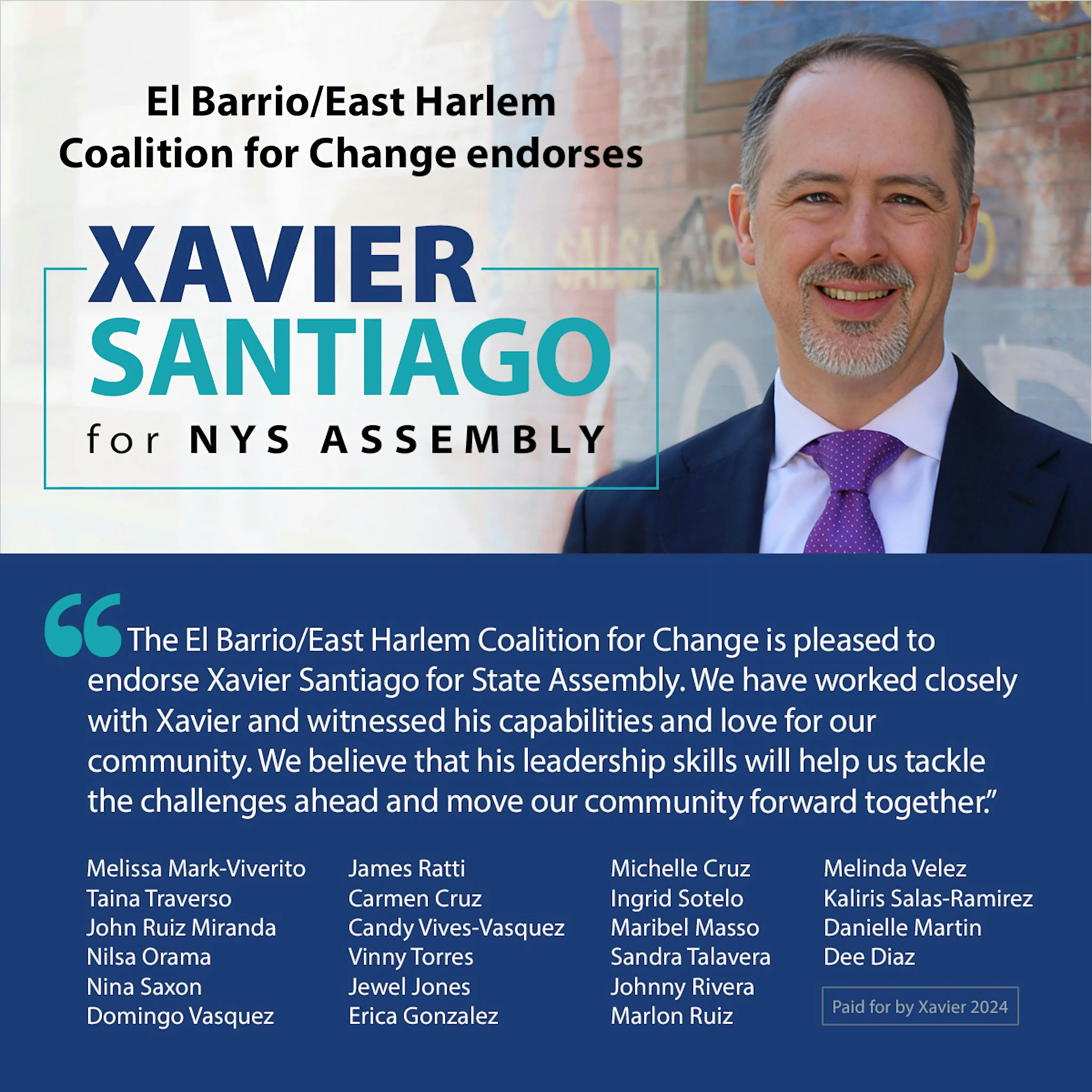 Xavier A. Santiago received the endorsement from the El Barrio/East Harlem Coalition for Change, which includes respected community leaders, two District Leaders, and the former Speaker of the City Council!